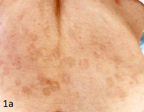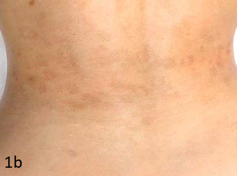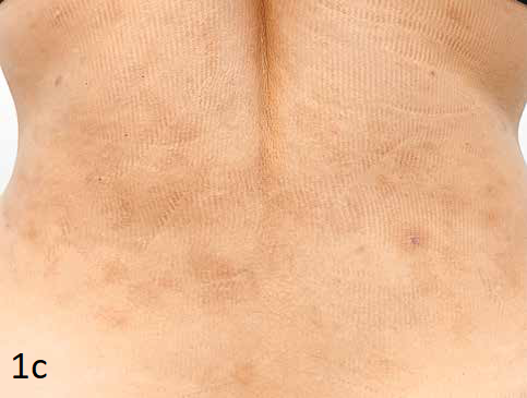 Пациент — женщина, 32 года. Жалобы на поствоспалительную гиперпигментацию, возникшую после второй процедуры BBL. Ранее обращалась к врачу-косметологу по поводу гипопигментации и мелких рубцов, возникших после угревой болезни в области поясницы. Процедуры BBL выполнялись с интервалом в один месяц (параметры установить не представляется возможным). Пациент обратилась в нашу клинику спустя год после возникновения пигментации и через три месяца после двухмесячного курса самостоятельного приёма препарата с транексамовой кислотой — без положительной динамики. Объективно: в области поясницы — множественные пятна тёмно- и светло-коричневого цвета с неровными краями, не возвышающиеся над поверхностью кожи. Других жалоб нет. Принято решение провести курс комбинированной терапии: экзосомальный бустер Nouveau Visage Newderm Bright (Франция) в сочетании с поверхностным пилингом Gradient Reti Peel Pro (Россия) с мицеллированным ретинолом.